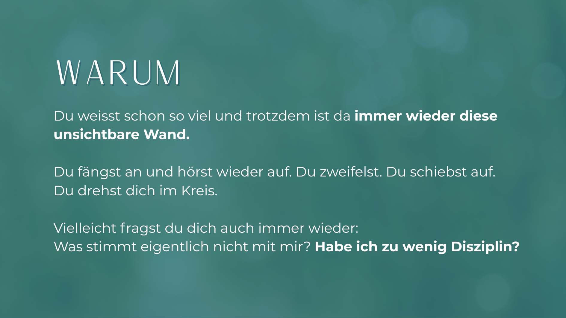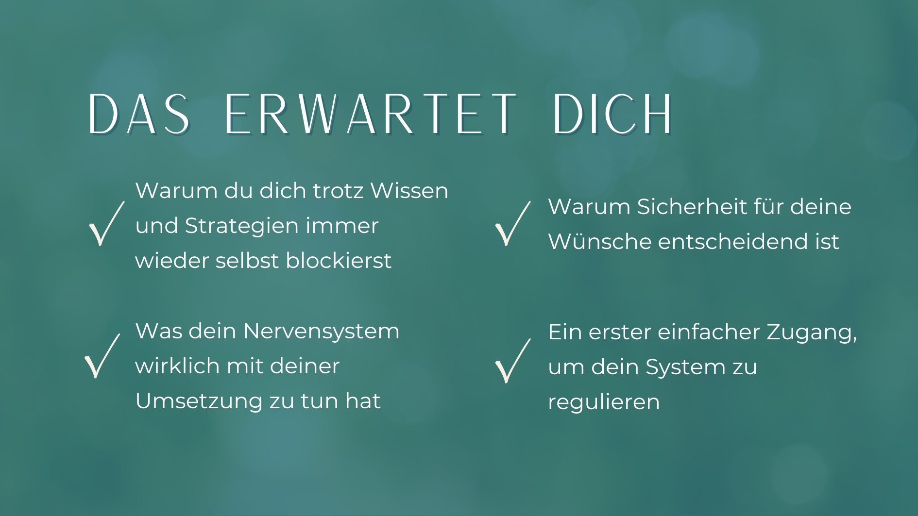 Du weißt so viel – und kommst trotzdem nicht voran? Erfahre in dieser Masterclass für 0 CHF, warum du dich immer wieder selbst blockierst, was dein Nervensystem damit zu tun hat und wie du endlich durch diese unsichtbare Wand kommst.